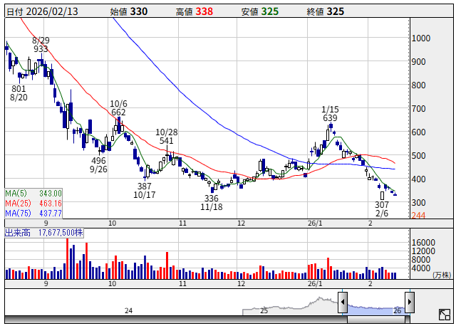 現在の株価が325円で、ときちの平均購入額はこの3倍くらいですから、大損です。