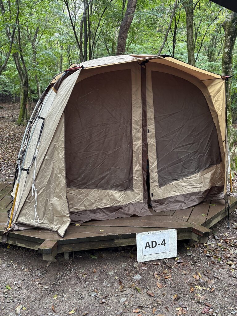 雨も降っていたのでそれはそれで良かったのですが、今回持参したテントが久しぶりに使うオガワのアポロンだったので、見事にウッドデッキ内にテントがおさまらず・・。