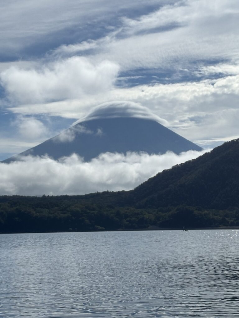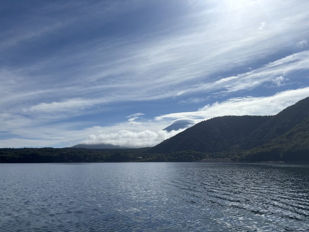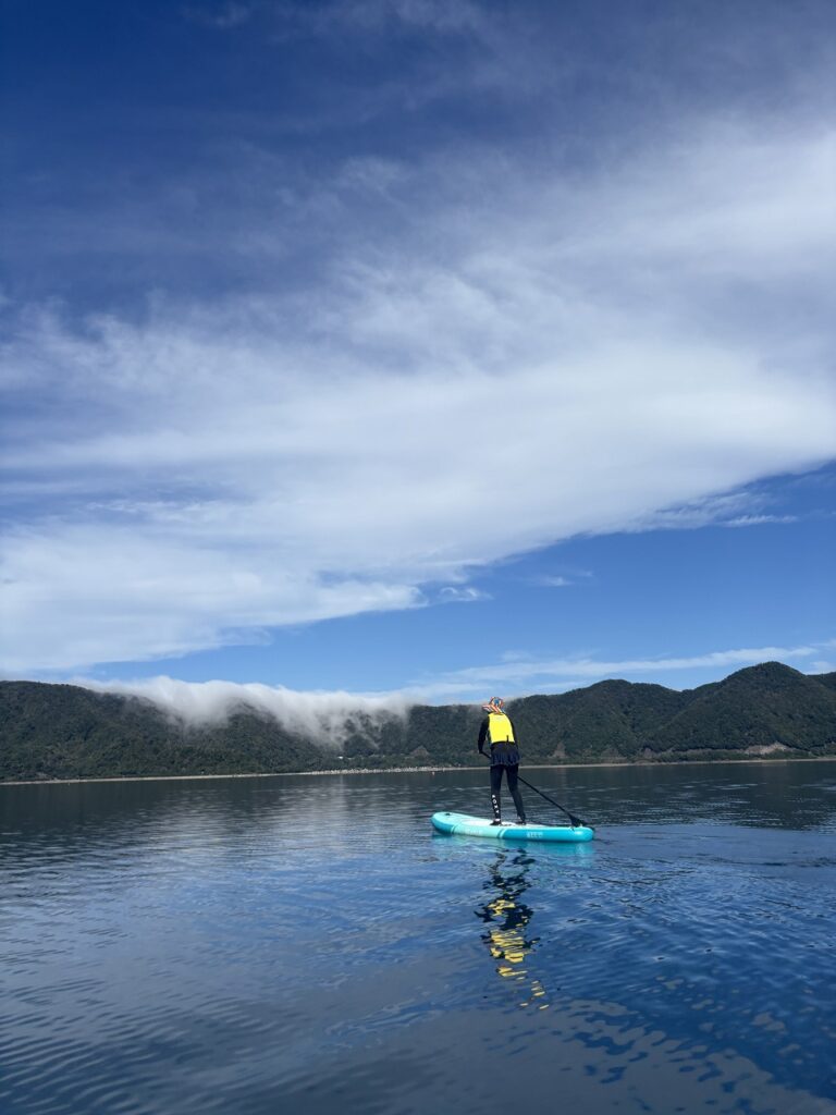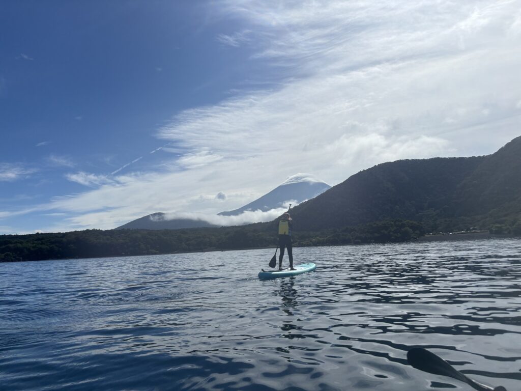 浩庵キャンプ場でSUPやったときは、富士山にむかってSUPするので、それも最高でしたが、今回は「富士山どこだ?!」と探しながらすすみ、ようやく見つけた富士山だったので、感動と感激の対面でした。