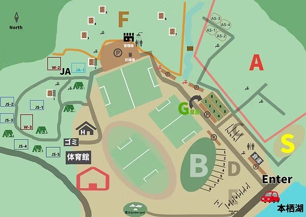 本栖湖にほぼ隣接するキャンプ場。本栖湖から道を挟んでキャンプ場の入口がありますので、キャンプ場から徒歩で本栖湖へ行けます。