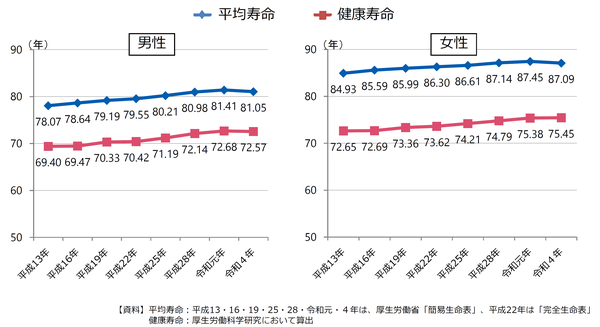 2025年の健康寿命は、男性で約72-73歳、女性で約75-76歳と推計されています。