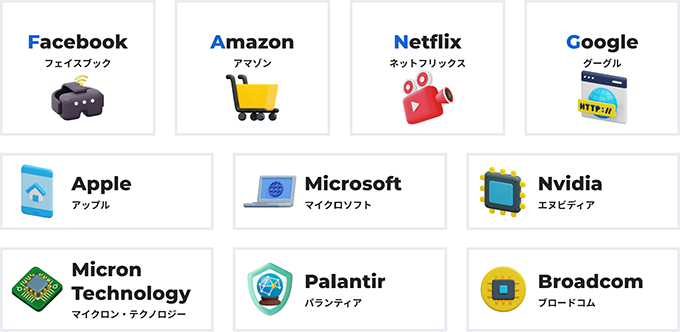 FANG+(ファングプラス)は、Meta、Apple、Amazon、Netflix、Alphabet(Google)、NVIDIA、Microsoft、Teslaなどの米国を代表するテック企業10銘柄に等金額投資する株価指数です。